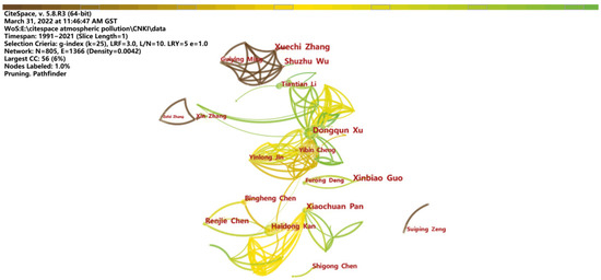 The author network mapping shows some of the major authors generated based on the Chinese literature, where the number of nodes is 805, the number of connections is 1366, and the density is 0.0042. This small density value indicates that the network of the whole mapping is more fragmented. As can be seen from Figure 3, the scholars with a larger number of nodes are Haidong Kan, Dongqun Xu, Bingheng Chen, Xiaochuan Pan, Xinbiao Guo, Tiantian Li, Renjie Chen, Shuzhu Wu and Xin Zhang, and larger nodes indicate more publications. In addition, the mapping shows several author sub-networks, implying that scholars communicate and cooperate with each other, and the sub-collaboration networks centered on teachers such as Xiaochuan Pan, Dongqun Xu, and Yinlong Jin are more obvious. The color of the connecting line corresponds to the color bar at the top of the figure. If the color of the connecting line corresponds to the brown color on the left side of the color bar, it means that the authors collaborated many years ago, and the green color on the right side means that the authors collaborated in recent years. It can be seen that the color of the collaboration network line of Xiaochuan Pan and Dongqun Xu is yellow and green, which indicates that the teachers have maintained their research in this field and contacted and cooperated with many other scholars for a long time, while several teachers, such as Haidong Kan, Bingheng Chen and Renjie Chen, who have also published more articles, have formed a mutual collaboration network, but have less communication with other scholars in comparison. The color of Shuzhu Wu’s collaborative network line shows that the time of publication and collaboration has been very early.