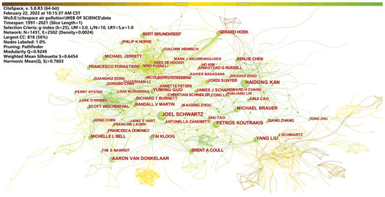 The number of nodes in the network map of English literature authors is 1451, the number of connections is 2502, and the density is 0.0024. This small density value indicates that the network of the whole mapping is more fragmented. As can be seen from Figure 4, the scholars with larger nodes are Joel Schwartz, Haidong Kan, Yuming Guo, Yang Liu, Petros Koutrakis, Aaron van Donkelaar and Michael Brauer. From the point of view of node color, these scholars have been researching for a long time and continue to plow deeply in this field. It is worth mentioning that Prof. Haidong Kan’s English posting volume is very high, but his cooperation network is not large compared with other scholars with a large amount of writing, combined with the previous Chinese literature analysis. Prof. Haidong Kan is a world leader in the number of Chinese and English publications in this field. In addition, the cooperation networks are mostly green and yellow, indicating that with the development of time, scholars pay more and more attention to mutual communication and cooperation; the cooperation has increased in recent years; and that there are many cooperative papers among various scholars.
