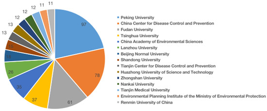 The research institutions that published Chinese research in this field of the relationship between air pollution and health are shown in Figure 5. Three institutions—Peking University, CDC, and Fudan University—lead other institutions in China in terms of the number of Chinese publications, with Peking University having the highest number of publications, and all of the above institutions have more than 60 publications. Figure 6 shows the number of publications in English by research institution, where the top five institutions in terms of the number of publications are the University of California System, Harvard University, Chinese Academy of Sciences, Harvard T H Chan School of Public Health, and Peking University. As we can see, Peking University is still on the list, with a large number of publications in both English and Chinese, and has accomplished much in this field.