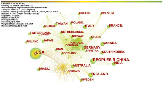 According to the map of national co-occurrence knowledge drawn by the Web of Science database (Figure 7), the USA ranked first in node size and number of connections, indicating that the United States not only published the most papers in this field but also had the most extensive foreign exchanges and cooperation. The United States, China, the United Kingdom, Canada, Italy, Germany, India, and Spain are the countries with the highest number of publications, indicating that these countries have strong scientific research capacity in the field of the relationship between air pollution and health. On the one hand, it can be seen from the analysis results of the above research institutions that many universities in these countries have strong scientific research and academic strength. On the other hand, most of these countries are mature industrialized developed countries, which have accumulated rich experience in the impact of air pollution on health. It can also be seen that the study of the impact of air pollution on health has become a hot issue worldwide.