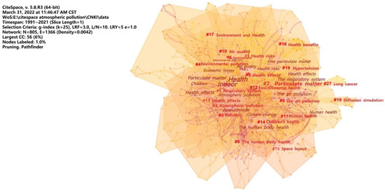 As shown in Figure 8, in addition to the subject terms of air pollution and health studied in this paper, the hot topics of the Chinese literature related to the study of the relationship between the two are mainly respiratory system, health risks and benefits, particulate matter, health effects and effects, air quality, human health, children’s health, spatial layout, hypertension, diffusion simulation, and lung cancer incidence. These high-frequency and high-centrality keywords represent, to some extent, the hot issues of research concerns on the relationship between air pollution and health in the Chinese literature during 1991–2021. Based on these words, the hot topics are summarized as follows. First, the types of air pollutants with health effects; second, the health effects of air pollution, which are found by the clustering results that the health effects of air pollution are mainly focused on making the public suffer from respiratory and cardiovascular diseases; third, the study groups are more all-age samples, as many articles focus on their effects on children’s health; fourth, what the spatial layout of air pollution is and the simulation of pollutant dispersion; and fifth, the causal effects of air pollution on health, and the assessment of health risks and benefits.