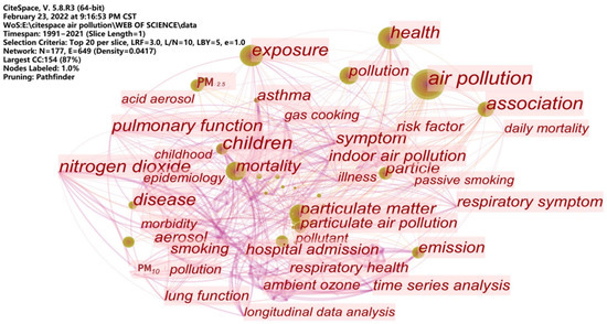 In Figure 9 and Table 2, excluding the article’s subject word “air pollution” and “health”, the key words that appear more frequently in the field of air pollution-health relationship research are mainly “exposure”, “association”, “mortality”, “particulate matter ”, “particulate air pollution”, “pollutant”, “disease”, “emission”, “children”, “asthma”, “PM2.5”, “risk”. From Table 2, the keywords with high centrality are mainly “air pollution”, “children”, “particulate matter”, “emission”, “association”, “exposure”. These high-frequency and high-centered keywords represent, to some extent, the hot issues in the field of air pollution and health that generally concerned the international academic community during 1991–2021. Based on these words, this paper classifies the hot topics into four categories: types of air pollutants that have health effects, ways of air pollutants affecting health, health consequences caused by air pollution, and groups affected by air pollution.