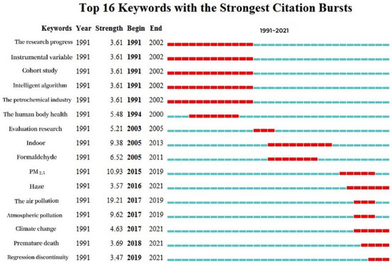 The burst keywords map of Chinese literature related to this paper is shown in Figure 10, and a total of 16 burst keywords were obtained. For example, it can be seen that the burst keywords during 1991–2002 are “research progress”, “instrumental variables”, “definite group research”, “intelligent algorithm”, “petrochemical industry”. Most of the keywords with large burst strength are atmospheric pollutants. It is worth noting that phrases such as “climate change”, “premature death”, and “regression discontinuity” have burst in recent years and continue to be used today, so they can be regarded as the main research trends in this field in China at present. The Chinese research frontier can be broadly summarized into three stages of evolution: early research frontier, middle research frontier, and latest research frontier.