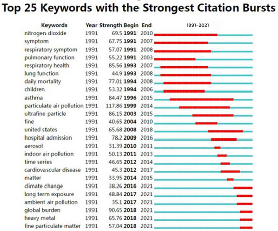 The keyword burst graph of the English literature shows 25 burst keywords (Figure 11). Unlike the visualization results of burst keywords in the Chinese literature, the overall results of the English literature do not seem to present obvious phase characteristics, so this section will analyze the contents of the figure from a broader perspective and summarize the characteristics of research frontiers in the English literature. From different evaluation indicators, first, the keywords with high burst strength are “particulate air pollution”, “global burden”, “respiratory health”, “asthma”, “hospital admission”, “daily mortality”, “nitrogen dioxide”, “symptom”, “heavy metal”, and “united states”. This represents that these words are influential research topics during their burst cycle. Second, many of the hot words have a longer burst time, and the keywords with a longer burst cycle include: “respiratory symptom”, “symptom”, “lung function”, “daily mortality”, “children”, “ultrafine particle”, “pulmonary function”, “united states”, “nitrogen dioxide”, and “asthma”. Third, keywords with burst end dates between 2010 and 2021 represent the more frontier research themes of recent years, mainly including: “nitrogen dioxide”, “asthma”, “particulate air pollution”, “ultrafine particle”, “fine”, “united states”, “hospital admission”, “aerosol”, “indoor air pollution”, “time series”, “cardiovascular disease”, “matter”, “climate change”, “long term exposure”, “ambient air pollution”, “global burden”, “heavy metal”, and “fine particulate matter”. Fourth, the keywords that have suddenly broken out in recent years and have been hot until now represent the latest frontier research themes in the field, which mainly include “climate change”, “long term exposure”, “ambient air pollution”, “global burden”, “heavy metal”, and “fine particulate matter”. According to the above analysis, this paper will discuss the key research frontiers and the development stages of research frontiers combined with relevant literature based on two perspectives: the strength of keyword burst and the evolution of burst keywords over time.