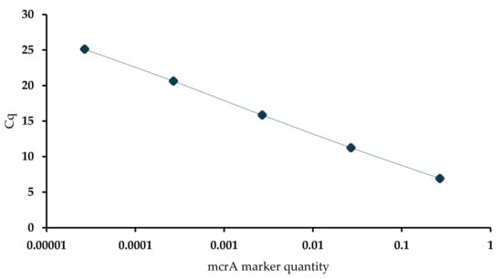 StepOne (Applied Biosystems, Waltham, MA USA) software was used to register the intensity of the fluorescence emitted by the fluorophore at each cycle of the qPCR reaction for each sample to estimate their Cq value (quantification cycle). The Cq value is the PCR cycle number at which the accumulating PCR products’ fluorescence reaches a pre-established threshold. It is inversely related to the starting amount of target DNA. Estimates of the Cq values for each sample are given in Table 3. In addition, the copy number of the mcrA gene using the amplicon size information obtained on the agarose gel, which was around 400 bp, was also estimated [56].