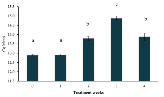 Effect of the treatment weeks over the Cq mean; different letters mean significant differences (p < 0.05) in the t-test.