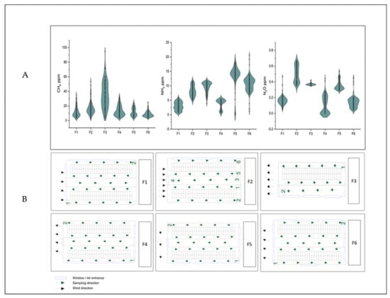 Prior to the barn measurements, the background concentration outside the barn was measured for at least 30 min. Then, the sampling was performed inside the barn including the halls where the animals were living. The concentrations of CH4, N2O, and NH3 were continuously measured. Triplicate measurements were taken at each point to obtain only gas concentrations within the barn moving towards a 1 m distance, taking equidistant points within the measurement area of the barn. The floor was made of concrete and was cleaned at least three times daily with an automated cleaning robot, and the measurements were taken before the robot initiated a cleaning cycle on the floor’s surface. The walking direction, farm orientation, passive airflow through open space sources, such as windows or doors, and architectural volume were considered. The number of open doors and windows varied on some farms; for example, F2 and F3 had just two doors on the sides, whereas F6 had the highest number with seven doors—three on two sides and one frontal door on the other walls—and F1–F6 possessed three open windows on the sides. Wind direction was also necessary to understand how the movements of the gases occurred inside the barn. The wind speed was between 3 and 5 m/s among all the farms. The wind direction was in the south direction for F1 and F5, southwest for F6, west for F4, and north for F2.