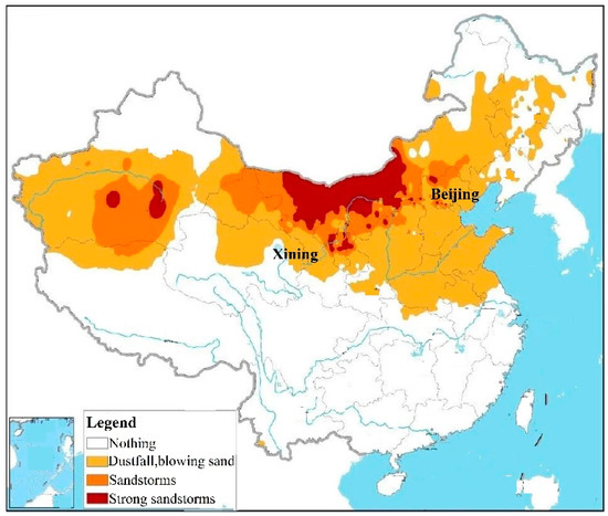 - Guo, L.; Fan, B.; Zhang, F.; Jin, Z.; Lin, H. The clustering of severe dust storm occurrence in China from 1958 to 2007. J. Geophys. Res. Atmos. 2018, 123, 8035–8046. [Google Scholar] [CrossRef]