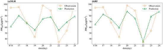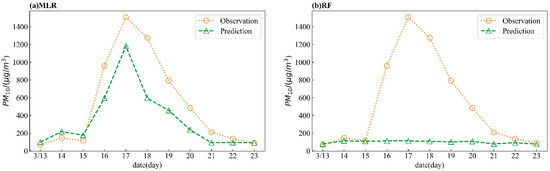 - The MA and MP during the clean period were much lower than that during the dust period; the PM10 of Zhangye City as an eigenvalue played an important role in predicting the PM10 of Xining City even during the clean period. In contrast to the dust period, the prediction effect of Random Forest was superior to Multiple Linear Regression during the clean period.