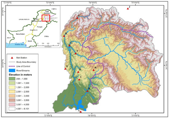 The Jhelum River is the major tributary of the Indus basin located in the north of Pakistan. The basin is the transboundary conflicted region divided by the line of control (LoC) between India and Pakistan. The geographical extent of the region exists between 73–75.63° E and 33–35.1° N, covering a total area of about 34,475 km2 (Figure 1). The river is fed by the glacier/snow melting of the drains from the top of the Himalayas mountains. The basin has a diverse altitudinal variation from 233 to 6178 m that covers the permanent snow-covered area in the north. The river basin has unique geomorphology and heterogeneous lithology with varied hydrological conditions which add up to the basin being more susceptible to climate change []. The climate of the basin has diversity in terms of spatio-temporal variability. The precipitation in the basin is dominant by the two seasonal rainfall regimes, monsoons during summer and western disturbances during winter. The details of the eleven meteorological stations of the basin are described in Table 1.