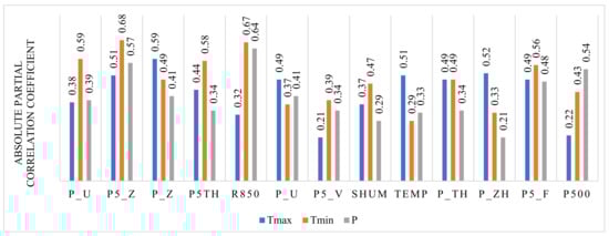 The twenty predictors (Table 2) analyzed by absolute partial correlation coefficient (abs P) between the predictors and predictands are summarized in Figure 2. Among the selected thirteen predictors, 500 hPa vorticity (p5_z) depicted the highest relationship for Tmax, Tmin and precipitation while the predictor surface divergence (p_zh) showed the weakest relationship for the predictands. The best predictor for Tmax was surface vorticity (p_z) with highest value (0.59) and minimum relationship (0.22) of predictor with 500 hPa geopotential height (p500). The best predictor for Tmin was 500 hPa vorticity (p5_z) and for precipitation was 850 hPa relative humidity (r850). The weakest relationship of Tmin existed with predictor mean temperature at 2 m (temp) and of precipitation with surface divergence (p_zh). These thirteen predictors were further used in the downscaling process and the selection criteria, based on the previous studies [].