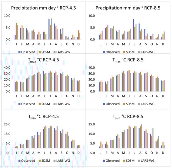 The GCMs’ (CCSM4 and HadCM3) data were downscaled by using statistical downscaling methods (SDSM and LARS-WG) during the calibration period (1976–2005). The results of calibrations are plotted against the observed referenced data in Figure 3. The calibration results depicted that SDSM yields more accurate and good quality time series data for Tmax and Tmin against the observations for the calibration period. On the contrary, LARS-WG predicted more accurate precipitation time series data. The precipitation is the complex indicator and LARS-WG proved to be more accurate in recording extreme events and precipitation distribution. The results of the calibration period simulated against RCP-4.5 were more accurate in comparison to the RCP-8.5, as the later simulation were more exaggerated from the former one (Figure 3). The precipitation for the summer months i.e., June, July and August (JJA) were underestimated while for winter months, namely, December, January and February (DJF) were overestimated. The simulated results of Tmax for the calibration period were more accurate as compared to the Tmin which was a bit exaggerated for the winter months (Figure 3).