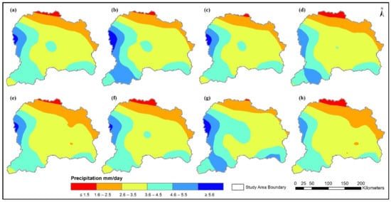 Spatial projections of precipitation (mm/day): (a) CCSM4 RCP-4.5 2021–2060; (b) CCSM4 RCP-4.5 2061–2099; (c) CCSM4 RCP-8.5 2021–2060; (d) CCSM4 RCP-8.5 2061–2099; (e) HadCM3 RCP-4.5 2021–2060; (f) HadCM3 RCP-4.5 2061–2099; (g) HadCM3 RCP-8.5 2021–2060; (h) HadCM3 RCP-8.5 2061–2099.