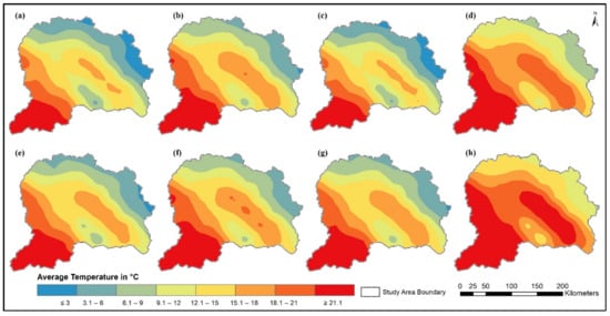 Spatial projections of average temperature (°C): (a) CCSM4 RCP-4.5 2021–2060; (b) CCSM4 RCP-4.5 2061–2099; (c) CCSM4 RCP-8.5 2021–2060; (d) CCSM4 RCP-8.5 2061–2099; (e) HadCM3 RCP-4.5 2021–2060; (f) HadCM3 RCP-4.5 2061–2099; (g) HadCM3 RCP-8.5 2021–2060; (h) HadCM3 RCP-8.5 2061–2099.
