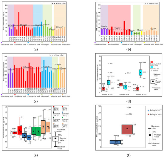 Comparison of measured data of NO2 and PM10 with the National Control Station data. (Data source: https://www.zq12369.com/, accessed on 1 August 2020). (a) Measured PM10 in the summer of 2016, (b) Measured PM10 in the winter of 2016, (c) Measured PM10 in the summer of 2017, (d) Concentration comparison in three seasons, (e) NO2 concentration from the National Control Station, (f) NO2 concentration from measured.