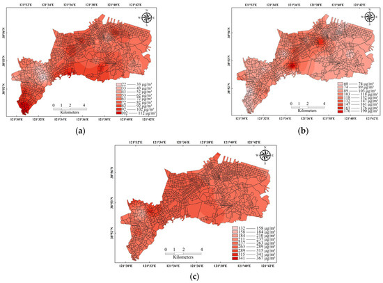 The distribution map of PM10 concentration in Dalian. (a) PM10 concentration in winter of 2016, (b) PM10 concentration in the summer of 2016, (c) PM10 concentration in the summer of 2017.
