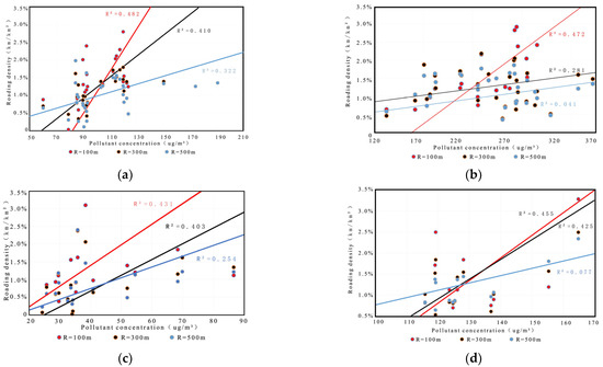 Linear correlation between pollutants and road density at three scales. (a) PM10 in the summer of 2016, (b) PM10 in the summer of 2017, (c) NO2 in the spring of 2017, (d) NO2 in the spring of 2018.