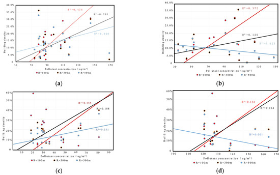 From Figure 7a,b, the linear correlation of PM10 concentration in winter at a radius of 500m is more significant than that at 100 m. The linear correlation between building density and PM10 concentration is the lowest within 300 m. Figure 7c,d shows a low linear correlation between NO2 and building density, proving that NO2 production is not closely related to building density. The measurement coefficient of PM10 under the condition of a radius of 500 m reaches 0.42, which is more than three times that under the condition of radius 100 m.