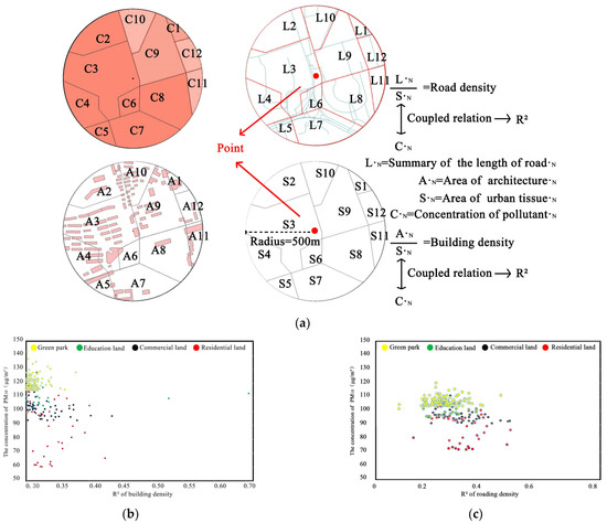 Linear correlation of PM10 concentration with road density and building density. (a) Method of verification, (b) PM10 with building density, (c) PM10 with road density.