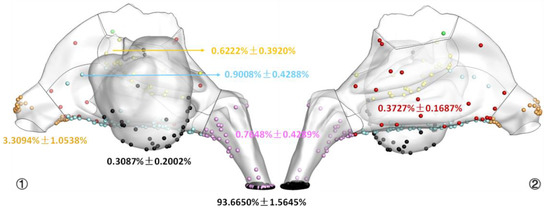 Particle deposition is actually a process in which inhaled particles are “captured” by the respiratory mucosa, rather than entering deeper airways. The deposition rate of each site can be calculated using the following formula: deposition rate = the number of local deposited spores/total number of spores inhaled. The rate of spores escaping from the nasopharynx and entering the lower airway such as the trachea, bronchus, and lung tissue is called the escape rate, which can be calculated using the following equation: escape rate = quantities of spores escaped from nasopharynx/total inhaled spores. The local deposition of A. niger spore particles in the 15 L/min inspiratory state is shown in Figure 4①,②. To better distinguish the overlapping areas in the complex 3D image of the nasal cavity, spore particles deposited at different anatomical sites are shown in different colors.