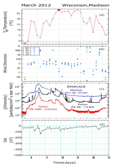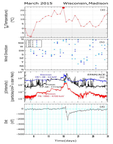 - Anagnostopoulos, G.; Menesidou, S.A.; Vassiliadis, V.; Rigas, A. Correlation between Solar Particles and Temperature in North-East USA. In Proceedings of the 12th Hel.A.S Conference, Thessaloniki, Greece, 28 June–2 July 2015. [Google Scholar]
