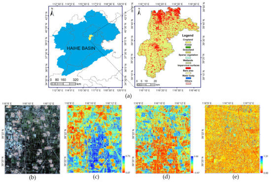 Satellite data of the study area: (a) relative location of the study area; (b) S2 image (in false-color composite: R = NIR, G = red, B = green), sample area from the study area; (c) NDVI calculated from an S2 image, sample area from the study area; (d) NDWI calculated from an S2 image, sample area from the study area; (e) MCARI calculated from an S2 image, sample area from the study area.