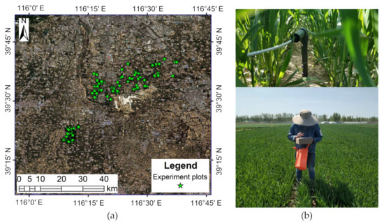 Basic information of in situ measurements: (a) distribution of experimental plots in the study area; (b) photograph of the scene.