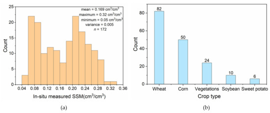 Statistics of in situ measured SSM: (a) distribution of in situ measured SSM; (b) in situ measurements for different crop types.