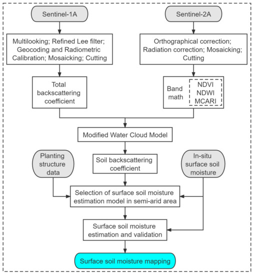 The workflow of our research is illustrated in Figure 4. First, the downloaded S1 images were preprocessed, and the backscattering coefficient images in the study area were obtained. Second, the backscattering coefficients of each sample were extracted according to the latitude and longitude. Third, the downloaded S2 images were preprocessed, and the spectral index images covering the study areas were obtained. Moreover, the vegetation indices of each sample were extracted according to the latitude and longitude coordinates. In order to eliminate the influence of vegetation on SSM inversion, the VWC estimation model was established by using the S2 spectral index. This model was substituted into the original WCM, and an improved WCM with the spectral index was established. Finally, the SSM estimation model was developed based on the improved WCM.