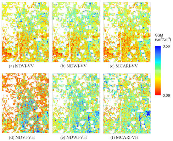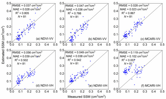 By comparing the R2, MAE, and RMSE of the six SSM estimation models with the measured values, it can be seen that the combined effect of VV polarization and MCARI is the best. As seen in Figure 6c, the best performance is the combination of VV polarization and MCARI, with RMSE, MAE, and R2 of 0.028 cm3/cm3, 0.023 cm3/cm3, and 0.867, respectively. Compared to the republished research [42] using single RS data, the method of combining the S1 and S2 images acquired higher accuracy. In summary, we chose MCARI and VV polarization to estimate SSM in our study.