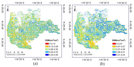 The model was used to estimate regional SSM from the S1 SAR and S2 MSI images in the vegetation-covered area under clear-sky conditions. Figure 7a,b shows the SSM (20 m × 20 m) maps in Daxing on 28 April 2019 and 29 April 2021, respectively. The spatial distribution of the estimated SSM has large variability with a range of 0–0.49 cm3/cm3, mainly distributed between 0.12 and 0.28 cm3/cm3 (Figure 7a). There were no significant drought events or other extreme weather events. As seen in Figure 7b, the fields are slightly wetter than in Figure 7a. The estimated SSM is below 0.44 cm3/cm3, and the eastern part is wet. This can provide valuable reference information for various types of applications, especially for water resource management.