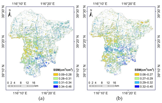 SSM mapping on two different dates: 28 April 2019 (a), and 29 April 2021 (b), in Gu’an, Hebei, China.