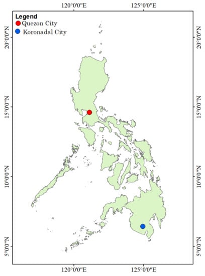 The Philippines is a tropical country and belongs to the Western North Pacific (WNP) boreal summer monsoon region. The wet season is experienced from May to October, while the dry season is experienced the rest of the year. Quezon City (QC) is located in the northeast part of Metropolitan Manila, on Luzon Island. It has a total area of 151.06 km2 [] and a population of 2,960,048 []. The city is situated on the Guadalupe Plateau and is largely rolling, with alternating ridges and lowlands. The lower part of the city has low-grade terrain, while the northern half is undulating and culminates at the Novaliches Reservoir []. Koronadal City (KC), on the other hand, is located on Mindanao Island and has a total land area of 277.0 km2. KC is surrounded by the mountain ranges of Roxas and Quezon. In general, the city has gently sloping terrain and 50% of the total land area is predominantly flat []. The latest Philippine Statistics Authority (PSA) census puts the total population of the city at 195,398 []. QC has an urbanization level of 100%, while KC has an urbanization level of 75.8% [].
