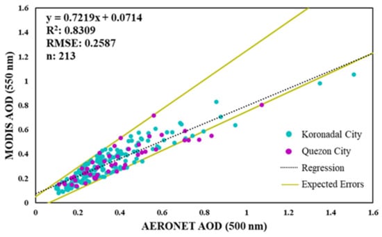 Validation of MODIS data was undertaken by comparing the MODIS AOD values to the AERONET AOD values. There were a total of 213 MODIS AOD datapoints with corresponding AERONET AOD values. For QC, there were no available data for the years 2016, 2017, 2019, and 2020, while for KC there were no available data for 2018. This is because either their acquisition time were not within the ± 30 min AERONET measurement time, their locations are not within the 3-by-3 pixel array, or they had fewer than six valid pixels. Table 1 shows the summary of the number of annual data from the MODIS AOD matched with the AERONET data used for the analysis for each study area. High cloud cover and particularly optically thin cirrus pose challenges in AOD retrieval and quality for both ground-based and satellite data measurements [,]. Coverage limitations due to the contamination of clouds and site limitations are the primary cause of low data volumes in Southeast Asia, including the Philippines.