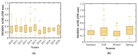 Statistics of seasonal MODIS AOD values at the two study areas from 2010 to 2020.