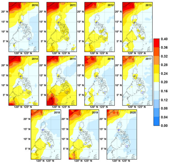 In the last few years, the process of remote aerosol retrieval from satellite sensors has progressed. One of these advancements is the derivation of aerosol products from the Moderate Resolution Imaging Spectroradiometer (MODIS) onboard NASA’s (National Aeronautics and Space Administration) Terra and Aqua satellites. Studies of and improvements to MODIS show that retrievals fall within the acceptable accuracy values []. There have been studies about aerosol trends in the Philippines [,,,,,]. Studies by [,] show that the Philippines, a maritime country, has the highest AOD concentration during October. This is due to the strong land and sea breeze created by warmer land surface temperatures. Long-range transport of anthropogenic emissions from East Asia and Indonesia also contributes to the elevated concentrations of aerosols [,,].