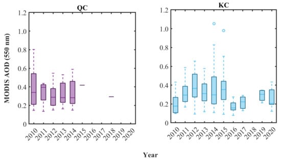 Figure 5 shows the boxplot for the annual concentrations for 11 years at the two sites. The mean and standard deviation are presented in Table 2. KC had the highest AOD concentration in 2014 ( = 0.39, = 0.28), while QC had the highest concentration in 2010 ( = 0.39). Overall, QC showed the highest concentration within the study period, with a total of 0.35, compared to KC value of = 0.32. To test the significance of the difference in concentration values from the two sites, hypothesis testing was performed using an independent t-test. The calculated p-value was 0.38 (p-value ≤ 0.05 means significant). This means that the variation in concentration values between the two sites is not significant, which could be attributed to the sources and quantities of aerosols received by the two study areas. QC is a highly urbanized city, where pollution is primarily caused by anthropogenic activities, but it is also affected by long-range aerosols from East Asia []. KC, on the other hand, is a city with a large percentage of its total land area covered by vegetation. Agriculture occupies 55% of the total area, open grasslands occupy 3%, and forest occupies 28% of total land area []. While KC also experiences biomass burning from local sources, the bulk of air pollution originates from maritime continent countries in Southeast Asia [,,]. The amount of data could also affect the calculated average AOD values of both sites, since some years are missing data values.