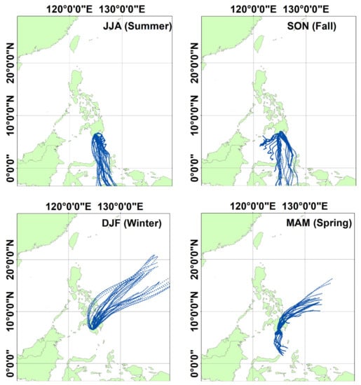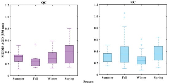 The boxplot of the seasonal variation between the two sites is shown in Figure 6, and the seasonal spatial distribution of AOD values is shown in Figure 7. For the seasonal variation in Figure 6, QC recorded the lowest mean AOD value (0.27) in fall, when the monsoon transition occurs, and the highest (0.40) in spring, as seen in Table 3. A wind back-trajectory analysis (Figure 8) of the northern part of the Philippines during this season showed that air volume comes from the Pacific Ocean by easterly winds, where no known large pollutant emitters are present. During spring, large concentrations of local sources, such as biomass burning and long-range transport pollutants from East Asia, are carried by strong daytime monsoon winds []. For KC, the highest AOD values occurred during fall. A wind back-trajectory analysis (Figure 9) during this season showed that the movement of air came from southwest and west of the site. During this time, Indonesia experiences a dry season that encourages biomass burning events that are made severe by high temperatures []. This increase in AOD values during fall in KC was a result of forest fires from Indonesia and Indochina [,].