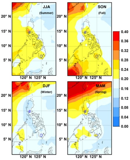 Spatial distribution of mean seasonal MODIS AOD values from 2010 to 2020 in the Philippines. Note that “☆” corresponds to Quezon City and “◯” corresponds to Koronadal City.