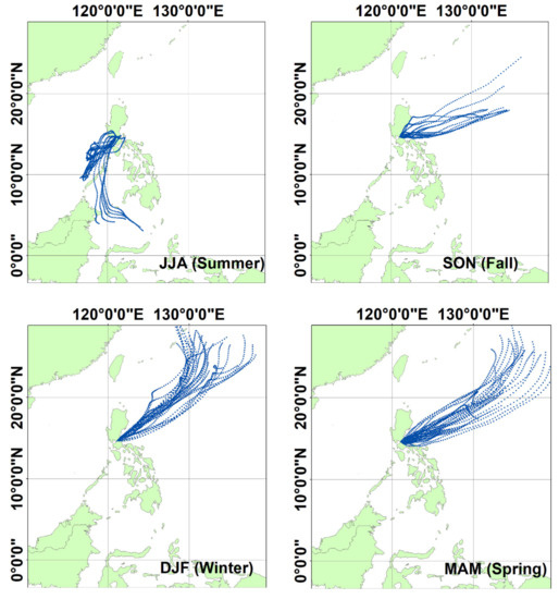 Cluster analysis of 72 h HYSPLIT-NCEP/NCAR wind back-trajectories arriving every 6 h for each season in Quezon City.