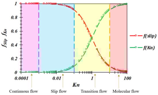 The slip flow weighting coefficients fslip-tube and Knudsen diffusion weighting coefficients fKn-tube calculated according to Equations (14) and (15) for different Kn numbers are shown in Figure 3. The calculation results show that: in the continuous flow region (Kn < 10−3), fKn is almost zero and Knudsen diffusion has almost no effect; in the slip flow region (10−3 < Kn < 10−1), with an increase in Kn number, the influence of Knudsen diffusion gradually increases. However, where the value of fKn is less than 0.1, the influence of Knudsen diffusion on the flow in this region is less than 10%. The gas mainly shows slip flow; in the transition flow region (10−1 < Kn < 10), the value of fKn and fslip change significantly with the number of Kn, and the influence of both Knudsen diffusion and slip flow on the flow in this region is more important; in the molecular flow region (Kn > 10), the weighting coefficient of slip flow is less than 0.1, and the gas mainly shows Knudsen diffusion. In summary, this weighting factor can characterize the flow state in the full Kn number range.