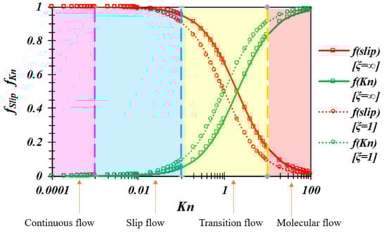 Considering the slit pore cross-sectional shape variation, the slip flow weight coefficients fslip and Knudsen diffusion weight coefficients fKn for different Kn numbers are calculated according to Equations (27) and (28) for the cases of ξ = 1.0 (minimum) and ξ = ∞ (maximum).