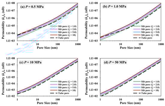 When slit pores and circular pores have the same pore scale (D = H) and different pressures are applied (P = 0.5 MPa, P = 1.0 MPa, P = 10 MPa, P = 50 MPa) the apparent permeability of the two types of pores was calculated and is shown in Figure 6. Comparing rectangular pores with different aspect ratios ξ, under different pressure and pore scale conditions, the permeability (kg)a of rectangular slit pores all increase with the value of ξ. When the slit pore widths H are the same, pores with higher aspect ratios ξ have higher pore cross-sectional area, so the pore transmission capacity is higher.