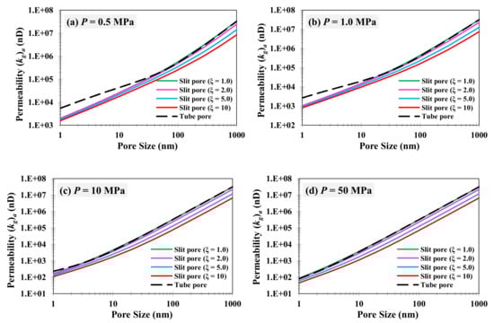When the slit pore and the circular pore have the same cross-sectional area, the apparent permeability calculations of the two types of pores under different pressure conditions (P = 0.5 MPa, P = 1.0 MPa, P = 10 MPa, P = 50 MPa) are shown in Figure 7, where the horizontal coordinate is the diameter D of the circular pore.