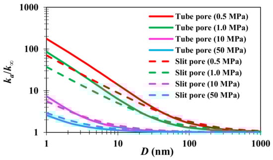 At T = 80 °C, the permeability ratios of the circular pores and slit pores (ξ = 10) are calculated based on Equations (33) and (35), as shown in Figure 8. The results show that the permeability (kg)a of 1~10 nm pores is greater than the absolute permeability (kg)∞ by about 10–200 times under the low pressure (0.5 MPa) condition; even under the high-pressure case (10 MPa), the permeability (kg)a of 1~10 nm pores is greater than (kg)∞ by 2~8 times. Therefore, within the 1~10 nm nanopores, the increase in apparent gas permeability caused by Knudsen diffusion and slip cannot be neglected. The nanoscale effect (Knudsen diffusion and slip) gradually decreases as the pore scale increases. At the same time, the nanoscale effect is more significant in circular pores, and the permeability “enhancement factor” of the circular pore is larger than that of the slit pore. This phenomenon is due to the fact that the pore surface area of the circular pore is larger and the collision effect between molecules and the wall is more significant under the same scale conditions; therefore, the nanoscale effect is stronger.