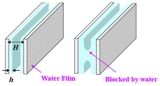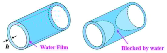 There are two distribution states of water film or capillary water in the water-bearing state of the pore. For nanoscale pores, when the pore is blocked by capillary water, it is difficult for the gas phase to flow [,,]. Therefore, the gas phase can flow only when the pore is in the “water film gas core” state (in Figure 9).