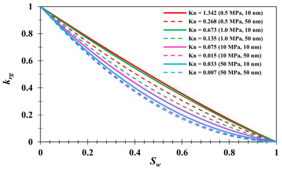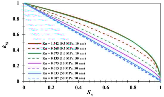 The relative permeability curves in circular pores with diameters D = 10 and 50 nm at T = 80 °C and pressures P = 0.5, 1.0, 10, and 50 MPa are shown in Figure 10. The Knudsen number in different cases ranges from 0.007 to 1.342, which are in the slip-off and transition flow stages. The calculation results show that the phase permeability curve appears as a “convex” curve when the Kn is high, and becomes gradually more linear as the Kn decreases. Equation (40) shows that at low Kn (Kn~10−3), the phase percolation curve tends to be a “1 − Sw” straight line. Therefore, the “convex” curve in Figure 10 in fact shows the nanoscale effect on the phase permeation curve: the higher the Knudsen number, the more severe the “upward convexity” of the phase permeation curve, and the gas phase permeability is higher than the “1 − Sw” line. Therefore, the nanoscale effect will weaken the effect of irreducible water on gas-phase permeability to some extent; the smaller the pore size and lower the pressure, the more significant the nanoscale effect and the weaker the effect of irreducible water on permeability.