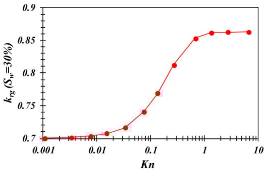 Relationship between krg and Kn at Sw = 30% (circular pore model).