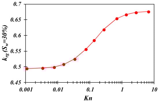 Further, under the condition of water content saturation Sw = 30%, the relationship between Kn and the relative gas permeability krg is shown in Figure 11. It can be seen that in instances where Kn < 0.001, krg is close to 0.7, which is consistent with the prediction of “1 − Sw”. Similarly, with the increase in Kn, the value of krg gradually increases. Finally, when Kn~1.0, the value of krg tends to be constant at 0.86. In general, for the circular pore, the gas phase permeability decreases 14~30% at the water content saturation of 30% and the degree of reduction mainly depends on the gas flow state (temperature, pressure, pore scale, etc.)