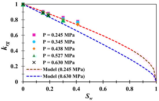 Using our model in Equation (43), krg of gas phase permeability under P = 0.245 and 0.630 MPa was calculated and compared with experimental results (Figure 16). The results show that the gas phase permeability curve at low pressure is obviously higher than that at high pressure, which is because the effect of collisions between the gas and the wall is more significant at low pressures, and leads to the Knudsen diffusion or slip flow in nanopores. At the same time, the fitting of model calculation and experimental results looks good, which indicates that the proposed analysis model of gas flow in nanopores under bound water is reasonable in this work.